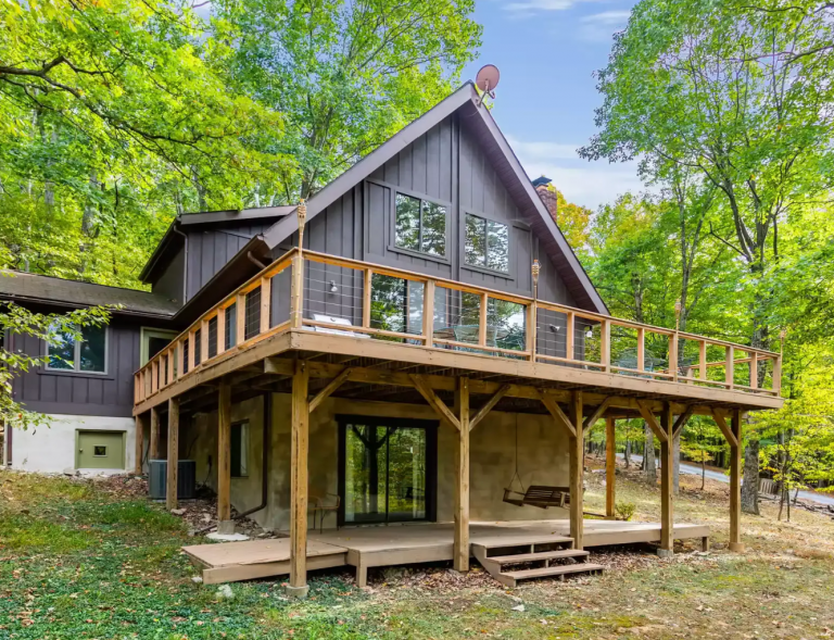 This cozy vacation rental cabin nestled in the West Virginia mountains has everything you need for your getaway. Just 100-yards from home lies a private lake, perfect for lounging, picnicking or fishing (your host has caught bluegills, bass, catfish, and more!) There’s also a doc and a floating platform in the middle of the lake. No need to leave your furry best friends at home, this family and dog-friendly cabin welcomes everyone to join for the fun. During the day, take a quick hike into Cacapon State park, accessible right from the cabin. Then spend evenings on the wraparound deck, grilling freshly caught fish, or gather for a rousing game of pool in the game room. Located near one of the most notable arts communities in the US, you’re sure to find something for everyone during your stay.