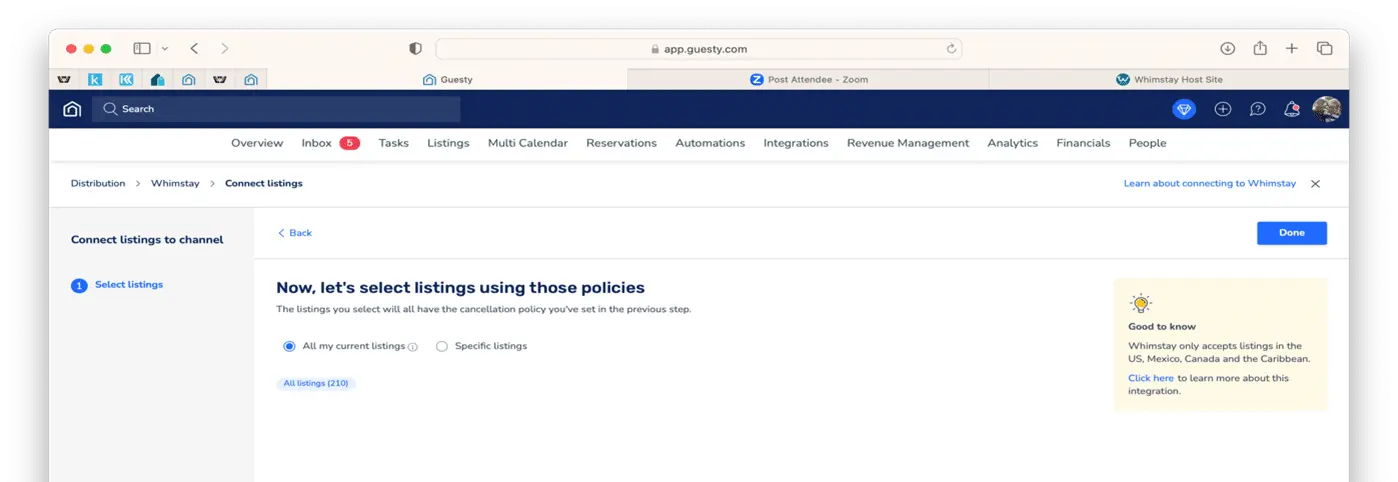 In Guesty, find the Growth icon in the tool bar. Next, click “Growth” from the menu bar then “Distribution”. Find the Whimstay card and click “Connect”.
